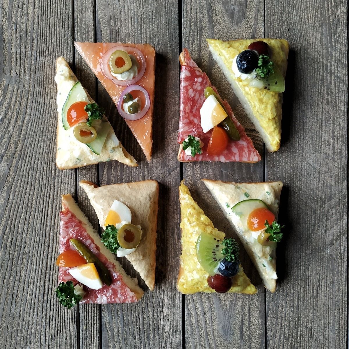 Hier die diagonal geschnittenen Toastscheiben mit herzhaften Belägen Fleisch, Fisch oder vegetarisch.