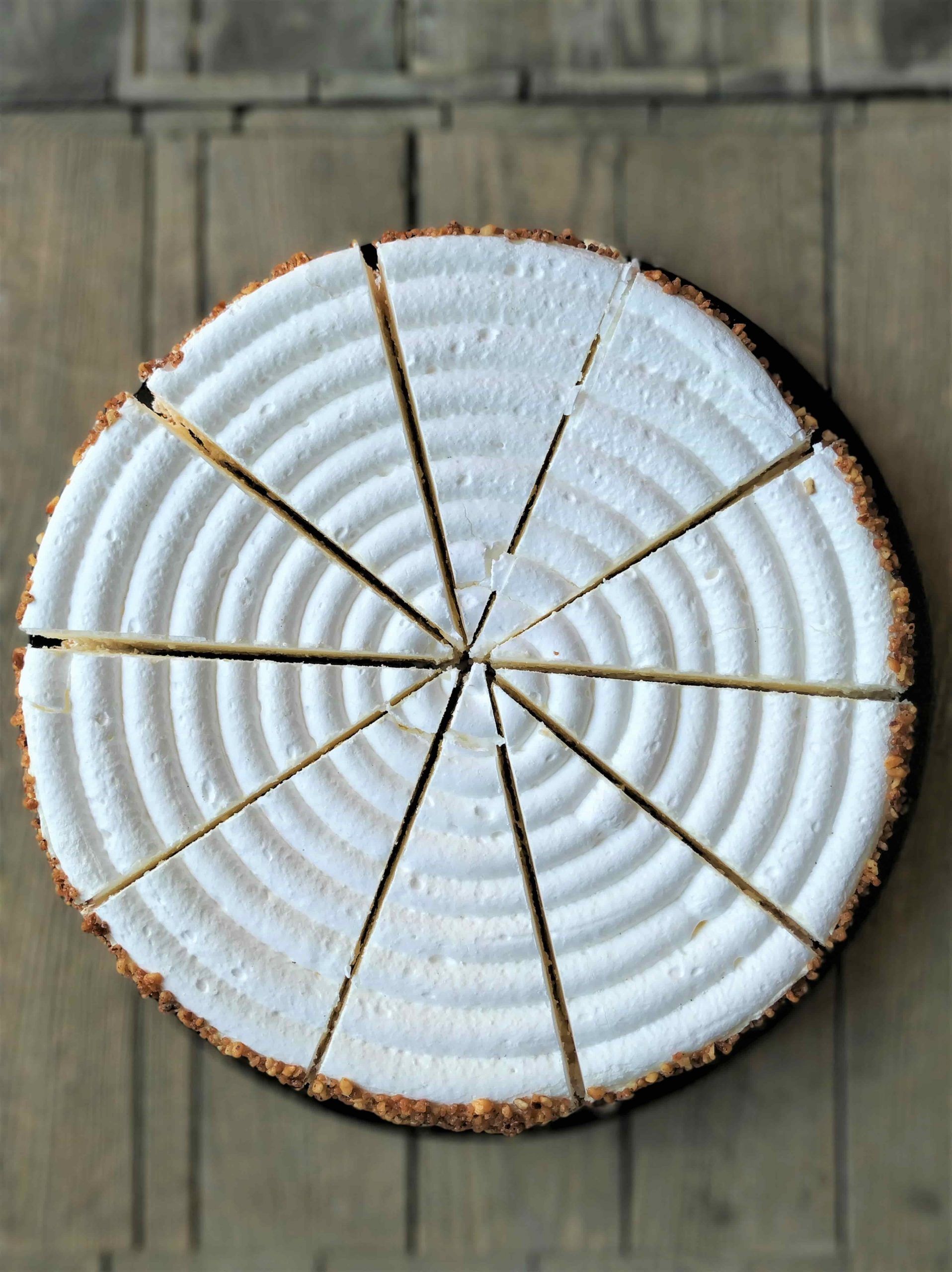Meringueboden, helles kirschgetränktes Biskuit mit Rahm und Krokant-Rand.