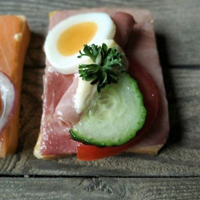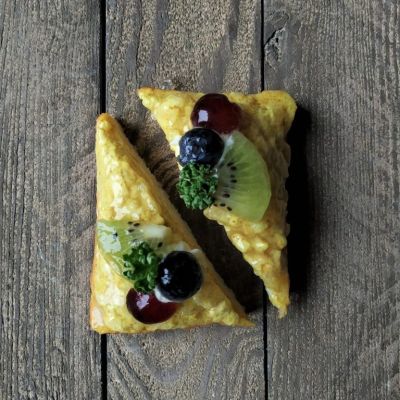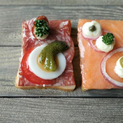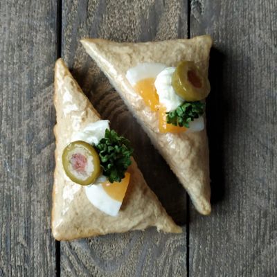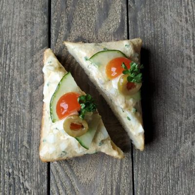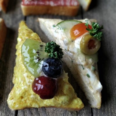 Hier die diagonal geschnittenen Toastscheiben mit herzhaften Belägen Fleisch, Fisch oder vegetarisch.