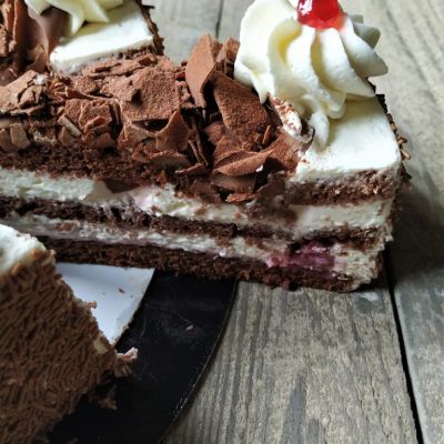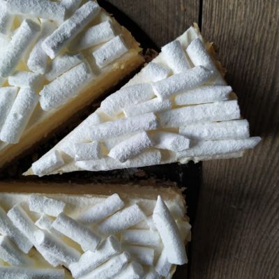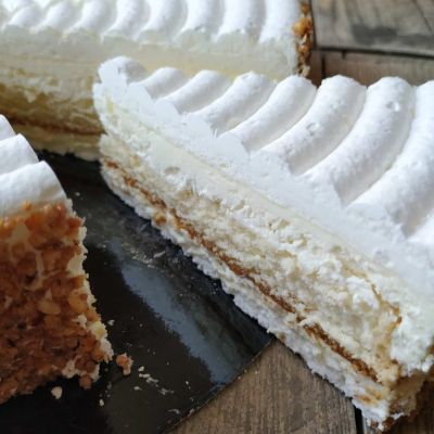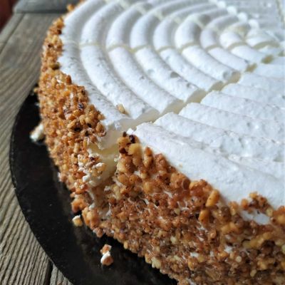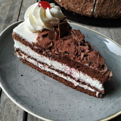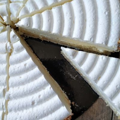 Meringueboden, helles kirschgetränktes Biskuit mit Rahm und Krokant-Rand.