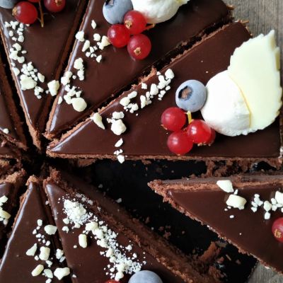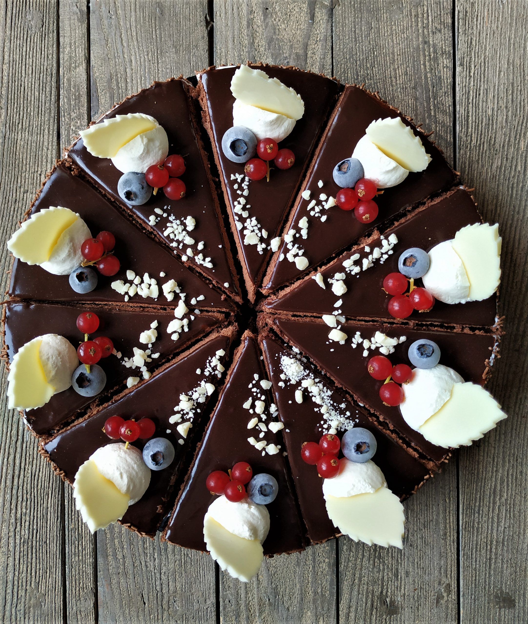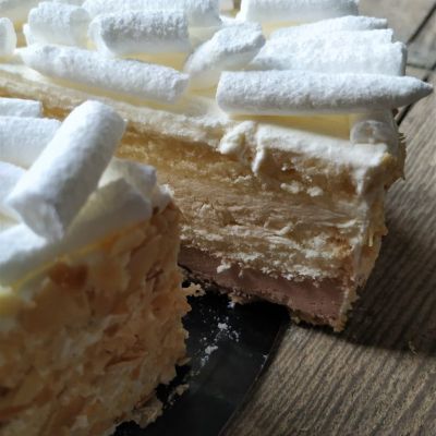 Linzerboden mit hellem Biskuit getränkt mit Thurgados. Dazwischen Schokoladen-Rahm und Thurgados-Crème.